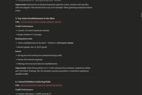 You can’t build an AI content auditor. You can build an AI content audit assistant that analyzes your site’s existing content, traffic data, and crawl data for opportunities. I’ll show you how I do it, from the inputs — ScreamingFrog, Google Analytics, DataForSEO — to the prompts and project.